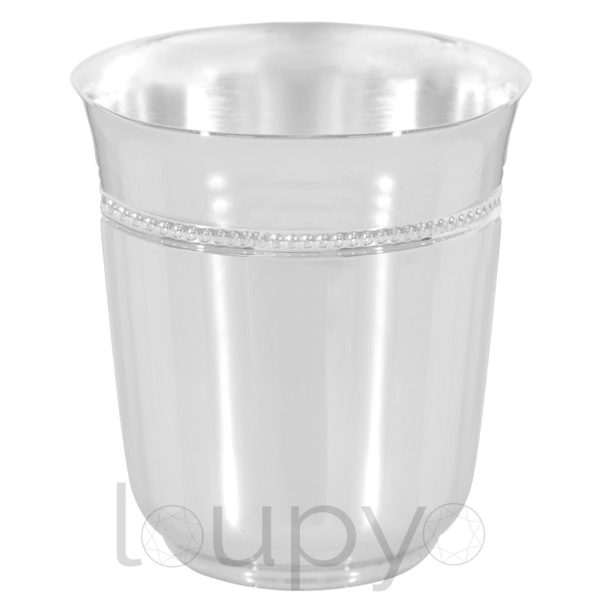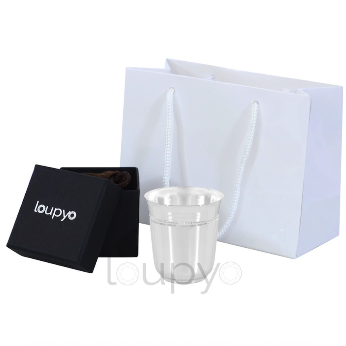 Timbale Perles Loupyo en métal argenté mesurant 7 cm de hauteur. Livré emballé dans une housse de protection marron anti-oxydante, dans un un coffret noir au nom de la marque, le tout dans un sac de shopping blanc.
